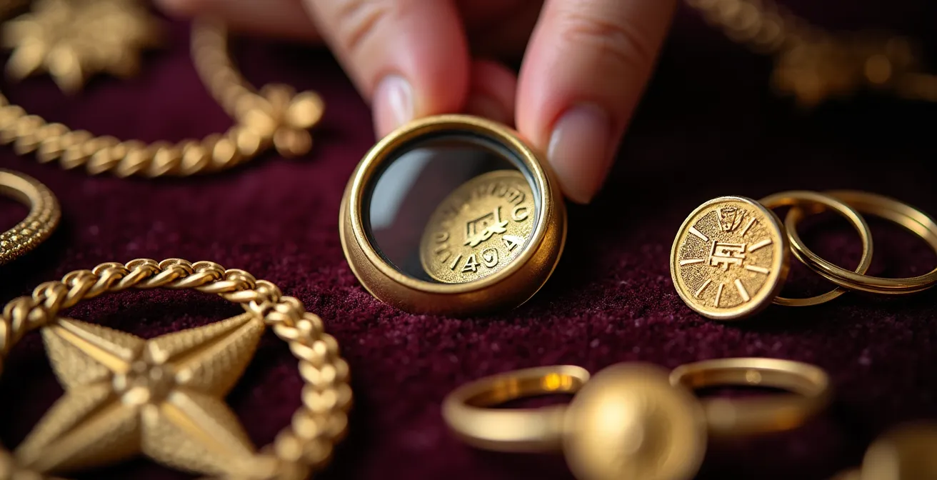 Une fois chaque pièce pesée, l’identification du poinçon à l’aide d’une loupe de joaillier (grossissement 10x) est cruciale. Cherchez les marques « 750 » (18 carats), « 585 » (14 carats) ou « 375 » (9 carats). En l’absence de poinçon, la prudence est de mise : le bijou peut être antérieur au système de poinçonnage obligatoire, plaqué, ou d’origine étrangère non conforme. Dans ce cas, seule une expertise chimique (test à l’acide) chez un professionnel pourra confirmer sa nature.