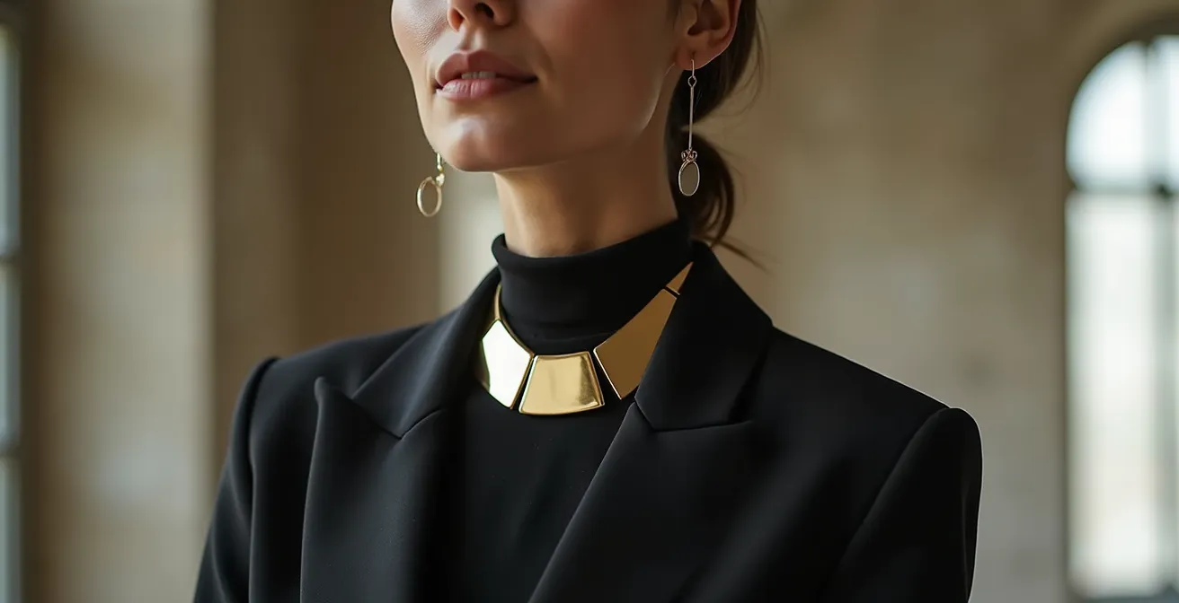 - Le bijou de caractère n’est pas un ajout, c’est la fondation architecturale qui structure une tenue monochrome.
